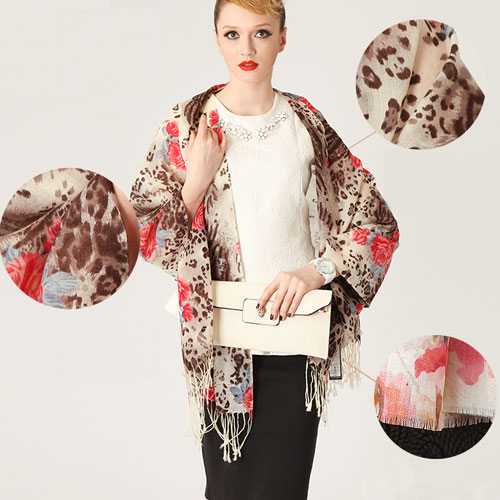 Made of 100% pure wool precious spinning textile, very soft and comfortable feeling, the bold and sexy leopard points with the blooming elegant and noble rose flower will be the eye-catching element for you at street or party. showing graceful as the scarf, and charming as the pashmina shawl wrap stole, both fashion and warm, and of course, you can aslo have multi different colors wind together to have the special visual impact.(Tips:In order to maintain the adventage of cashmere shawl scarves ,please using warm water and mild scour to knead when washing.Never insulate under the sun or hightemperature,and iron when dried.)