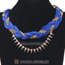 Gold Chain Braided Cyan Leather Collar Necklace With Crystal And Rivet Wholesale